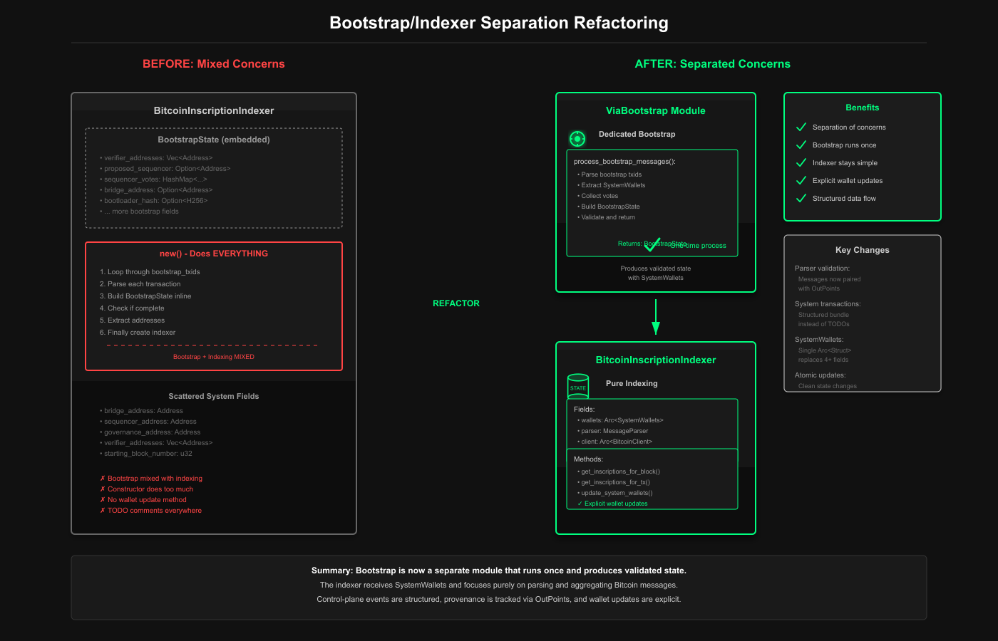 Separates bootstrap from indexing: Genesis processing ViaBootstrap It is now a standalone module that runs once and writes validated system wallets to the database. TheViaIndexer no longer replays Genesis on startup as it loads the current wallet state from storage