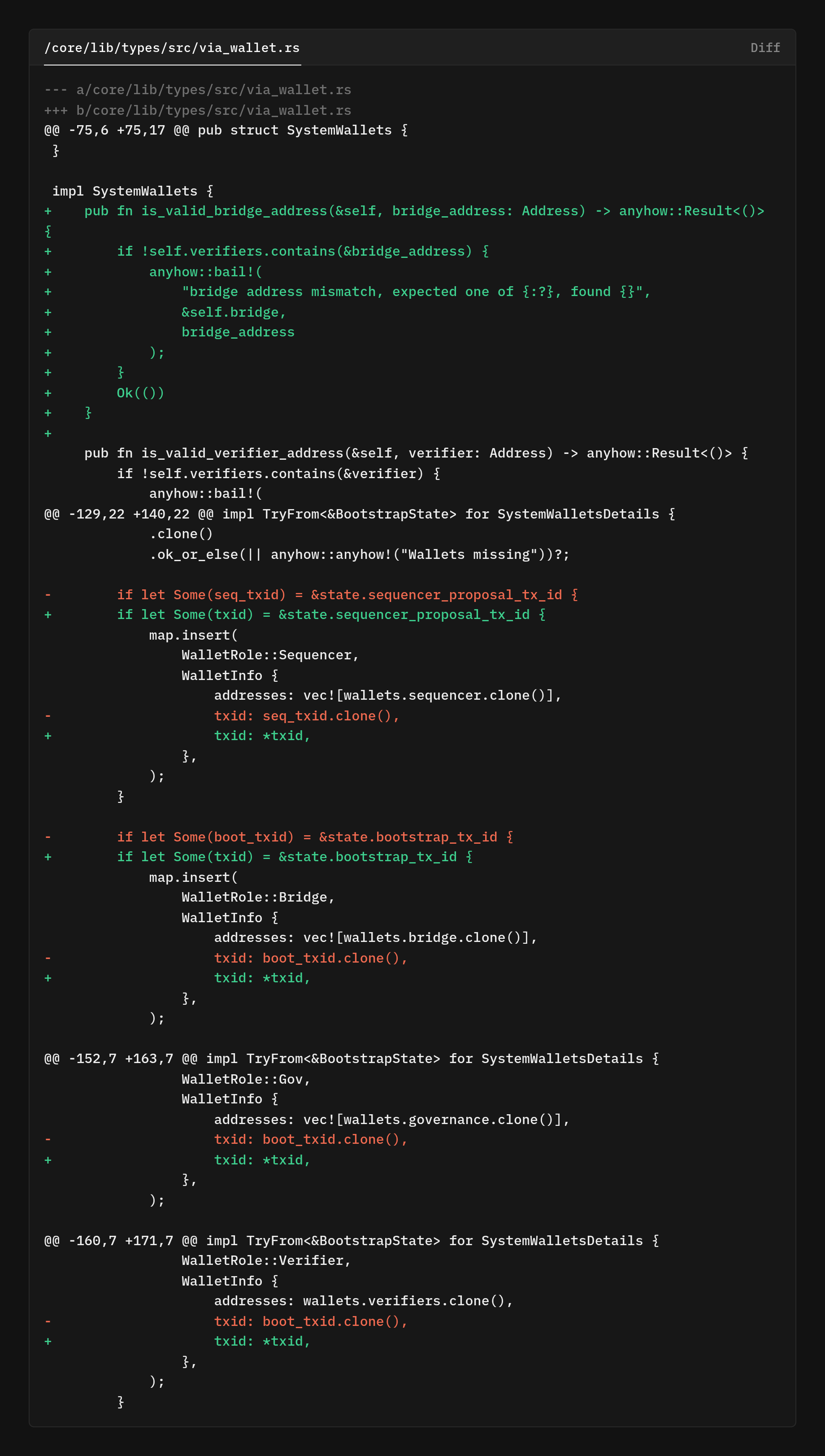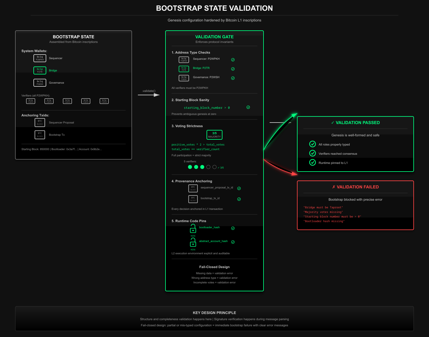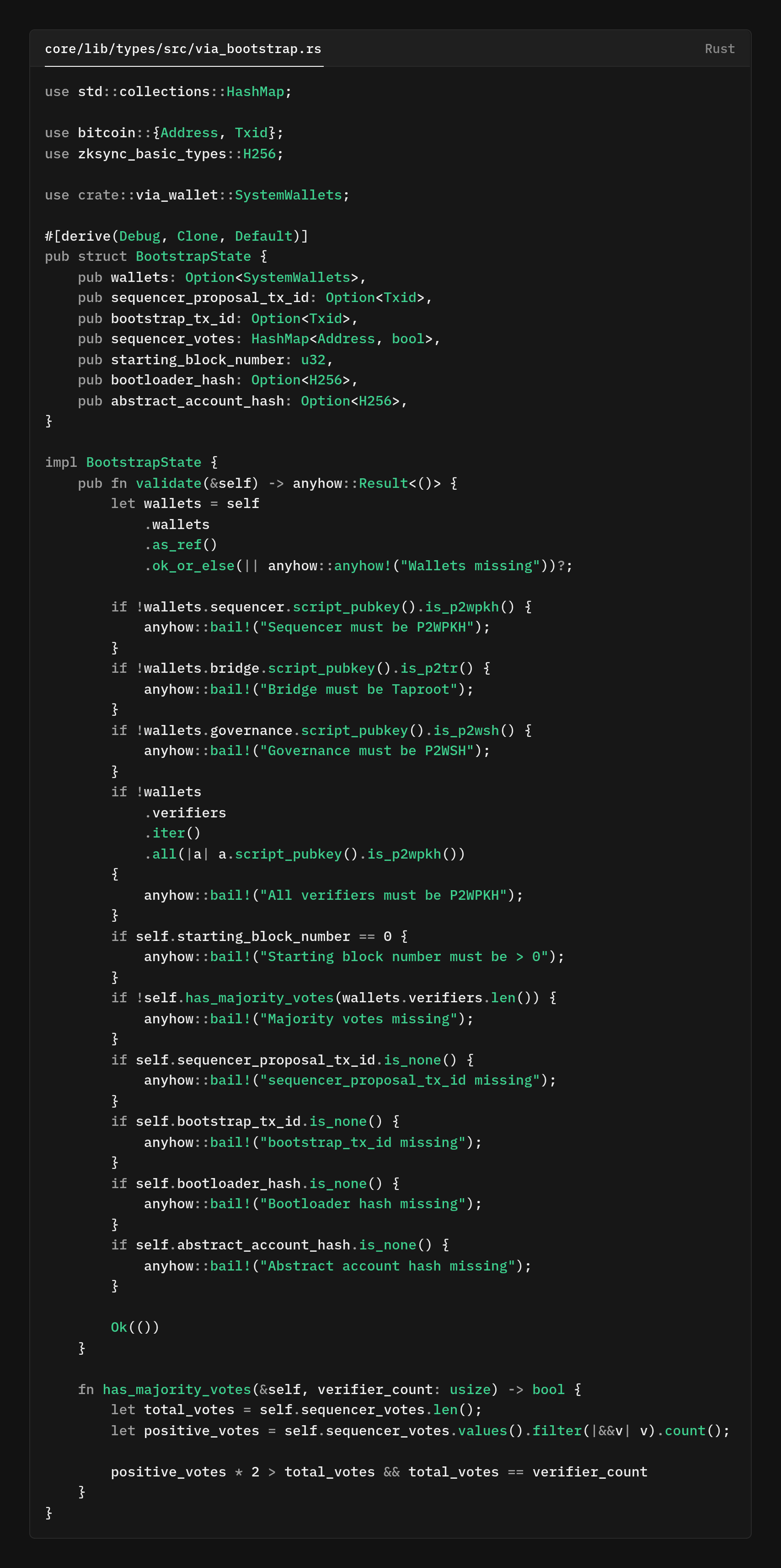 BootstrapState collects all of that. Once everything is known, the validate() function is called. Only if everything is correct, such as wallet script types, valid TXIDs, majority verifier approach, non-zero starting block, and defined code hashes. Only then is the bootstrap legitimate.