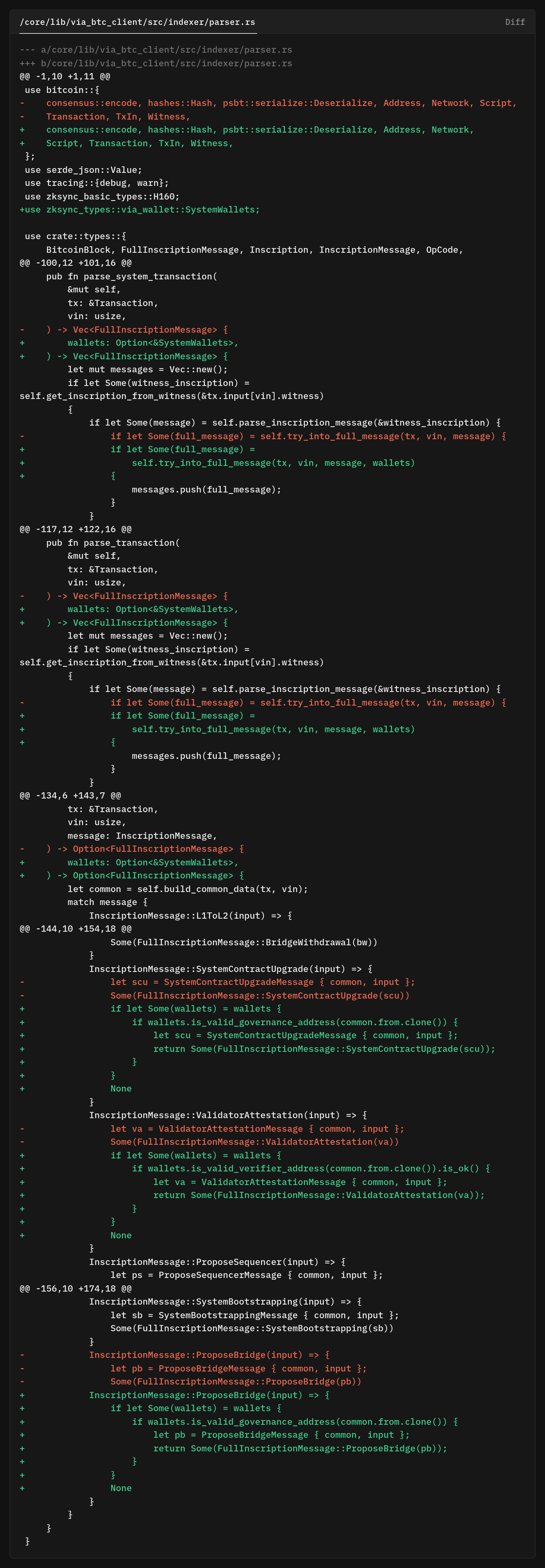 The parser now also verifies the sender. It can optionally take a snapshot of the system wallets (trusted Bitcoin addresses for governance, bridge, sequencer, and verifiers). For each inscription, it decodes the message and checks the sender against the expected role.