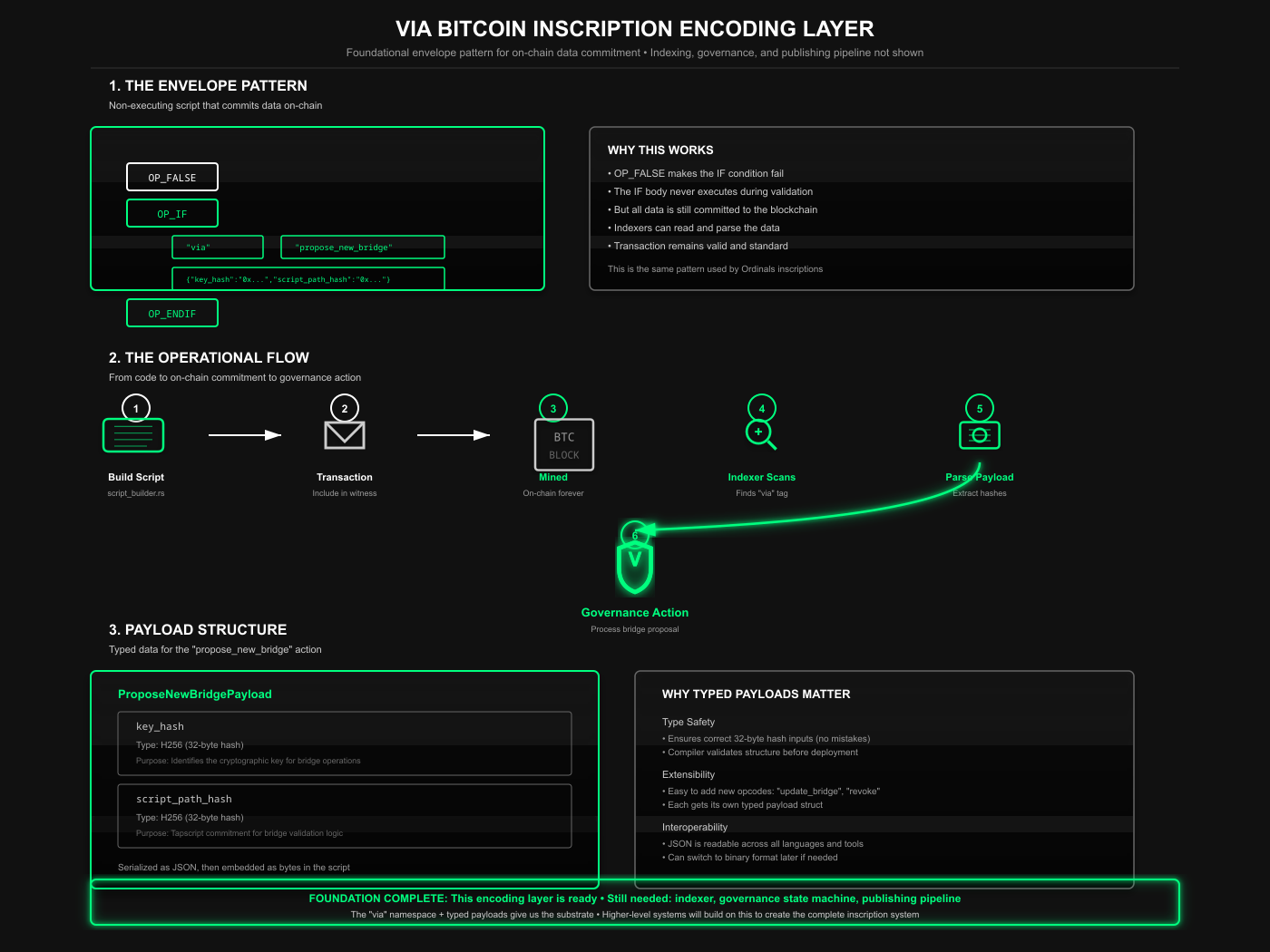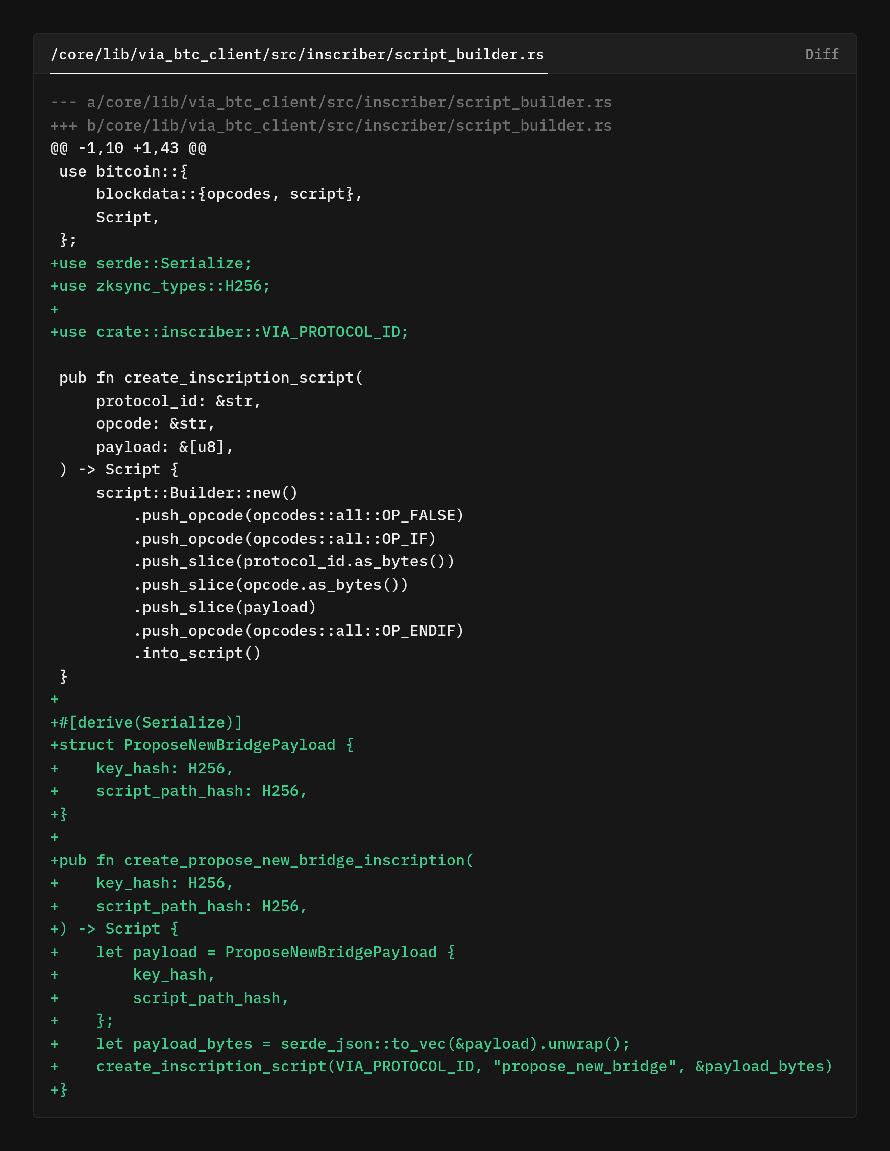 The inscription module defines a fixed protocol tag string via and provides builders that produce small Bitcoin scripts carrying Via messages. We get a consistent script envelope plus a specific message type for proposing a new bridge.