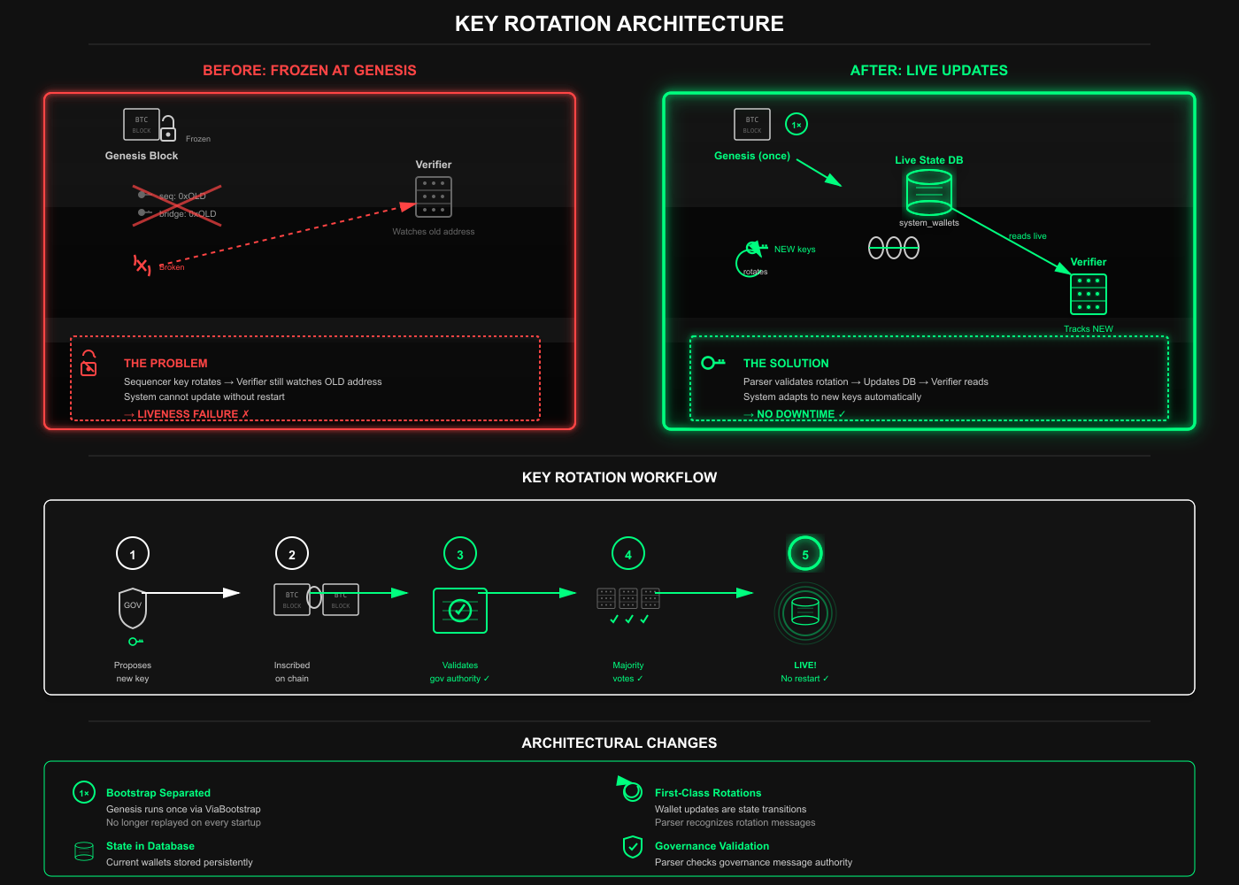 System wallets (sequencer, verifiers, bridge, governance) are no longer hardcoded facts learned at startup. They're tracked as state, validated against on-chain inscriptions, and updated atomically at runtime.