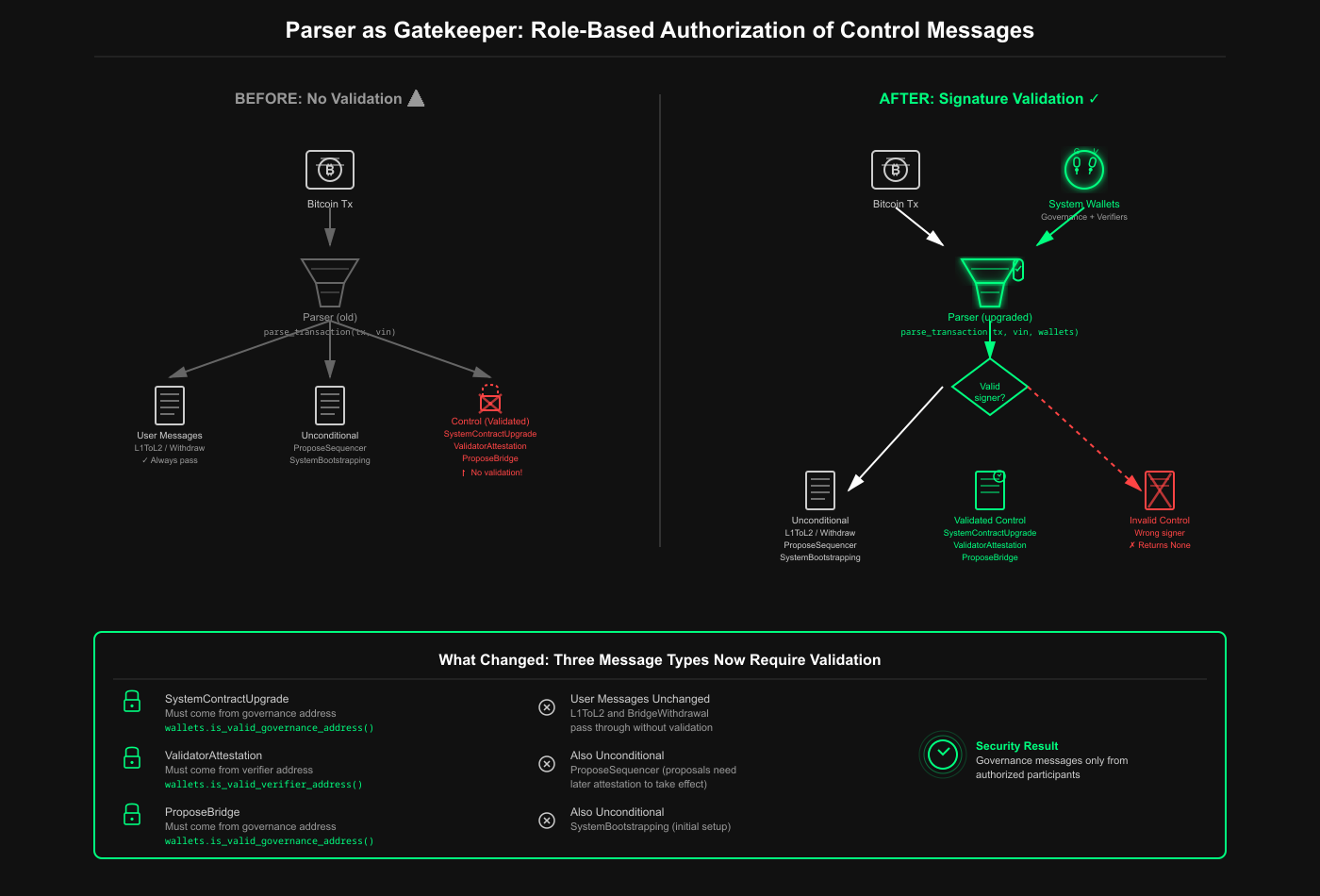 The parser has been extended to accept the current SystemWallets and to drop any control-plane message (sequencer proposals, bridge proposals, governance upgrades, validator attestations) that isn't signed by the expected signer for that role