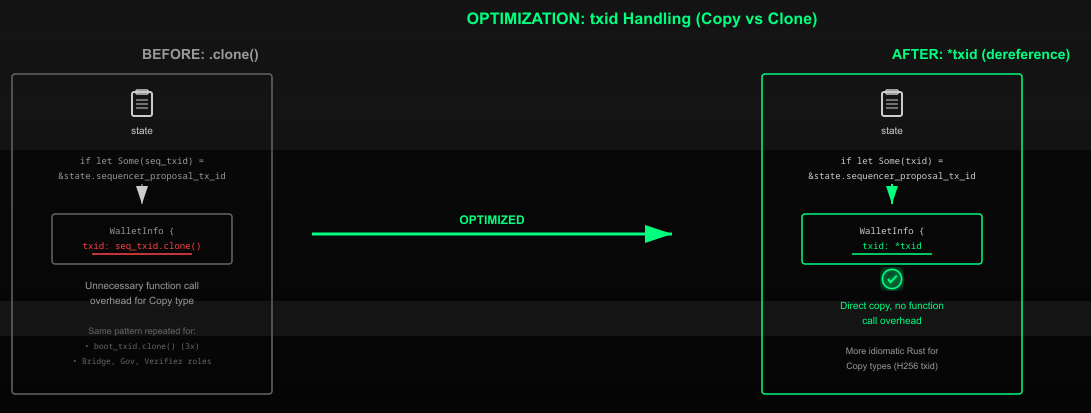 The old txid: seq_txid.clone() calls to Clone trait and results in a 32-byte copy to the stack. The new txid: *tx.id dereferences the reference.